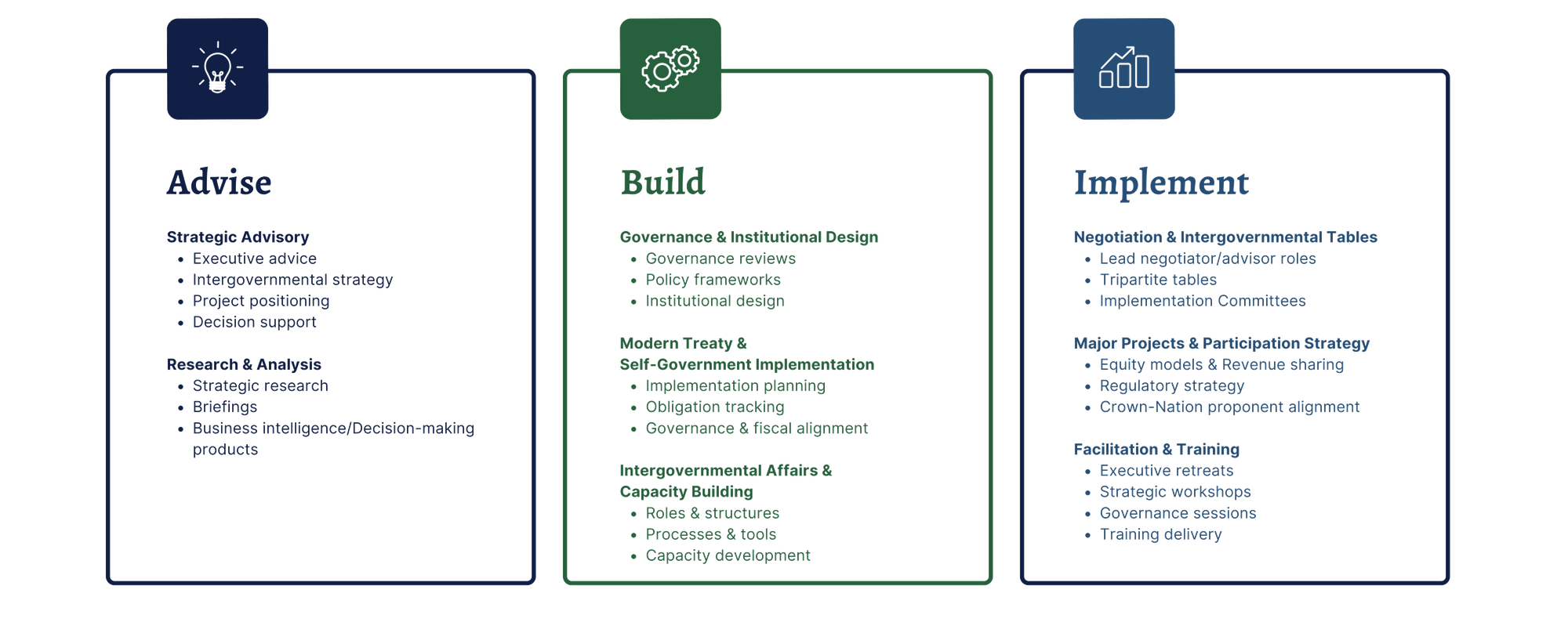 Kennedy Governance Strategies supports Indigenous governments and their partners across three modes of work: